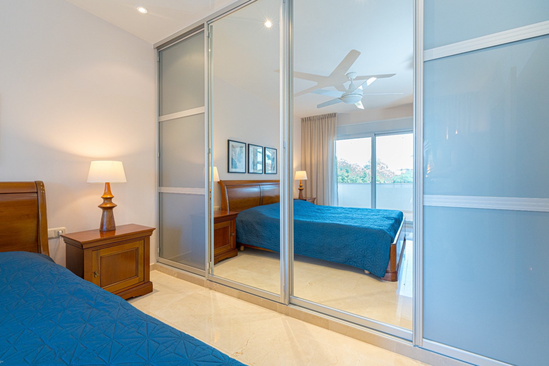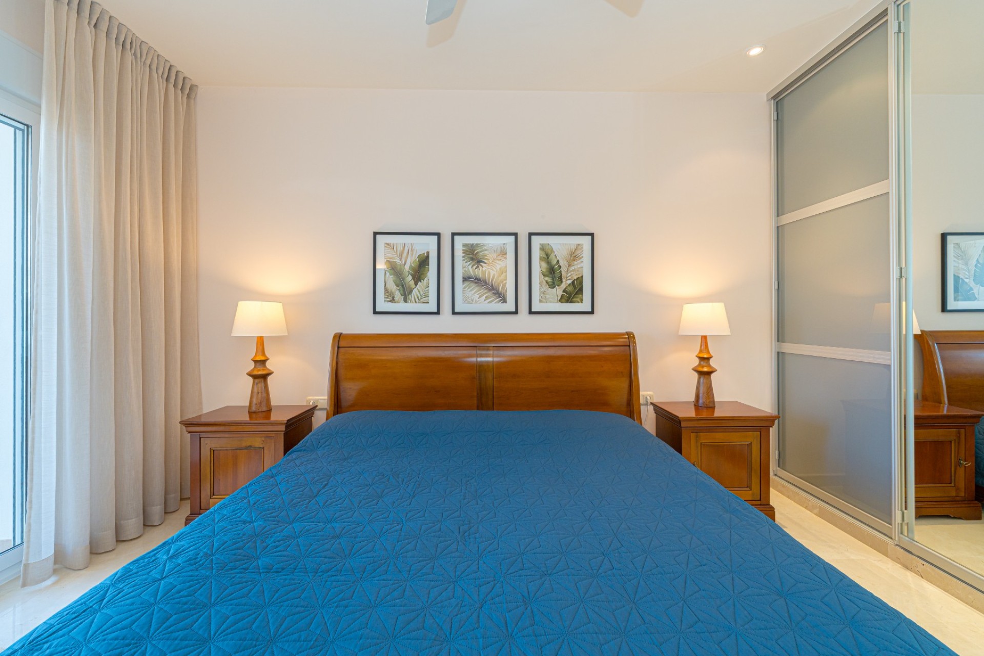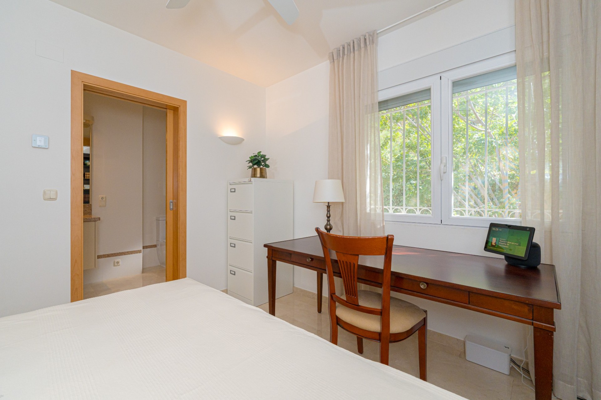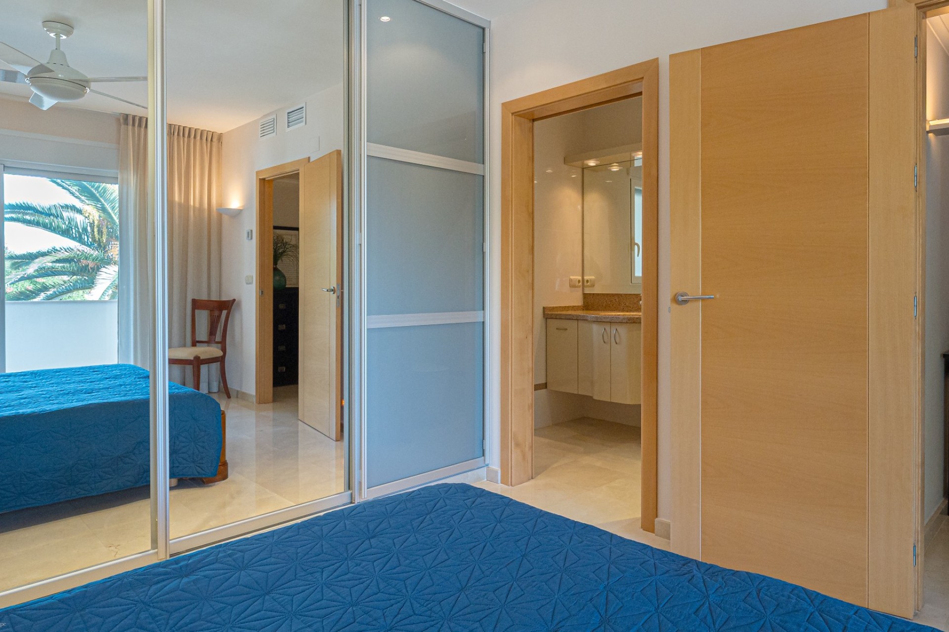 De indeling omvat vier slaapkamers, waarvan drie met een eigen badkamer. De master suite beschikt tevens over een apart privéterras, terwijl de vierde slaapkamer, momenteel in gebruik als kantoor, ook toegang heeft tot een privéterras. Op de begane grond heeft één van de slaapkamers een eigen badkamer, waardoor er een functionele leefruimte op één niveau ontstaat.