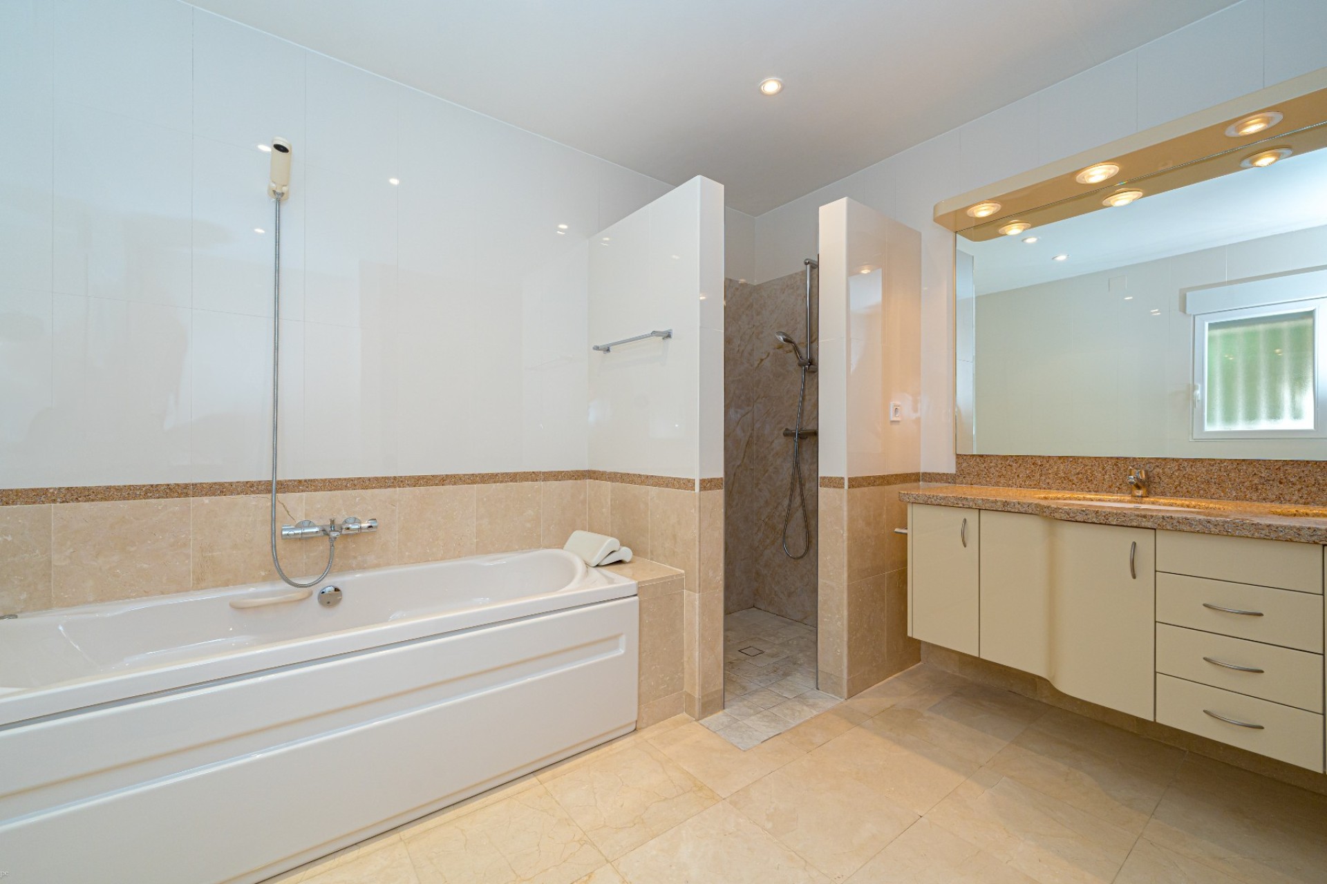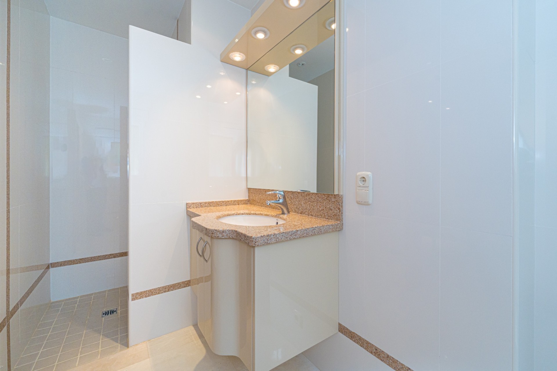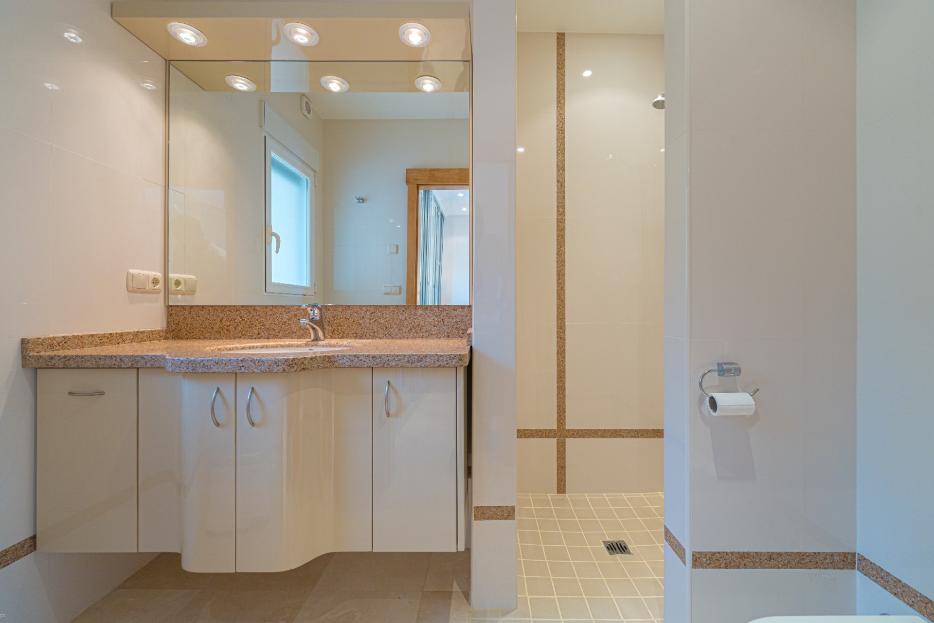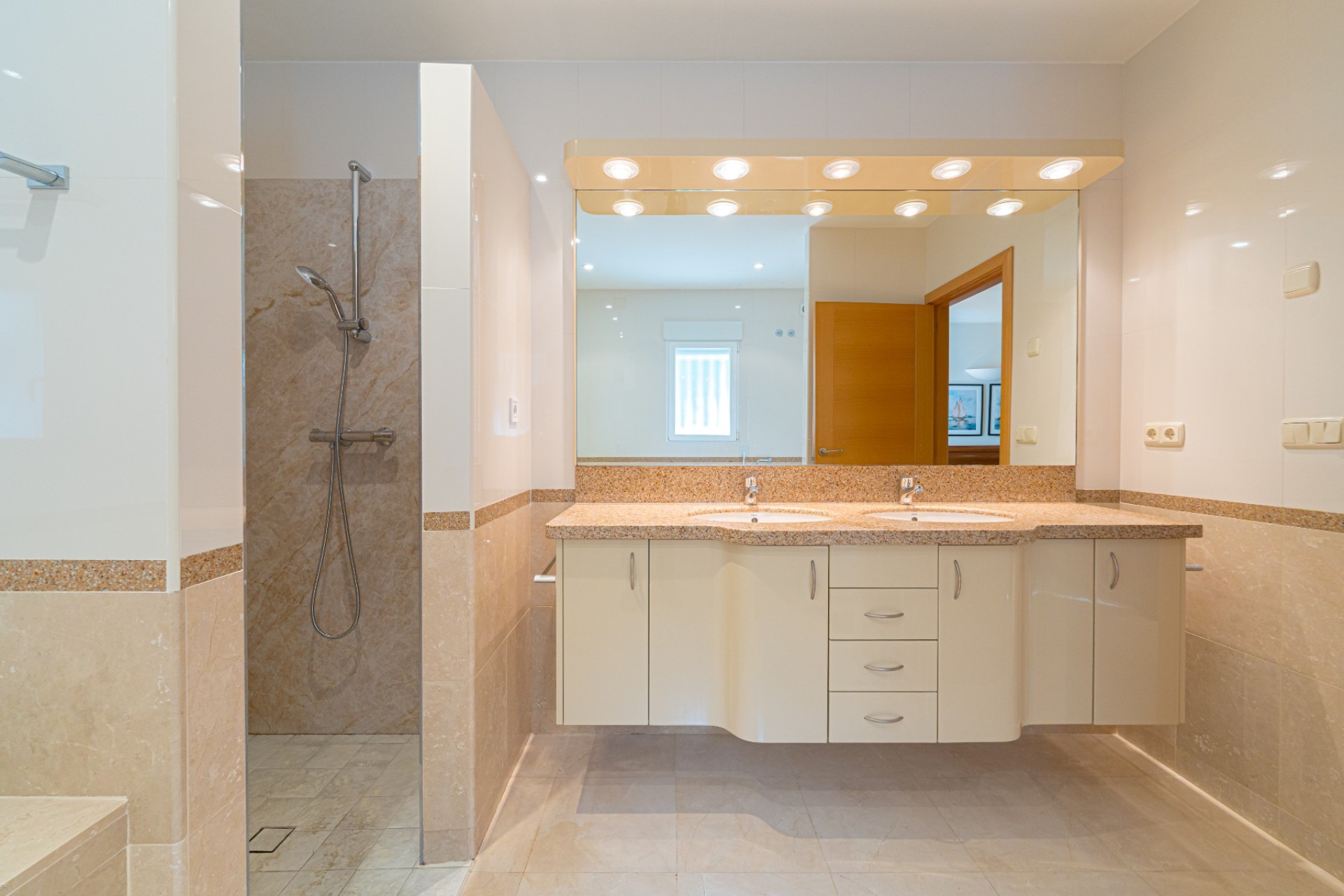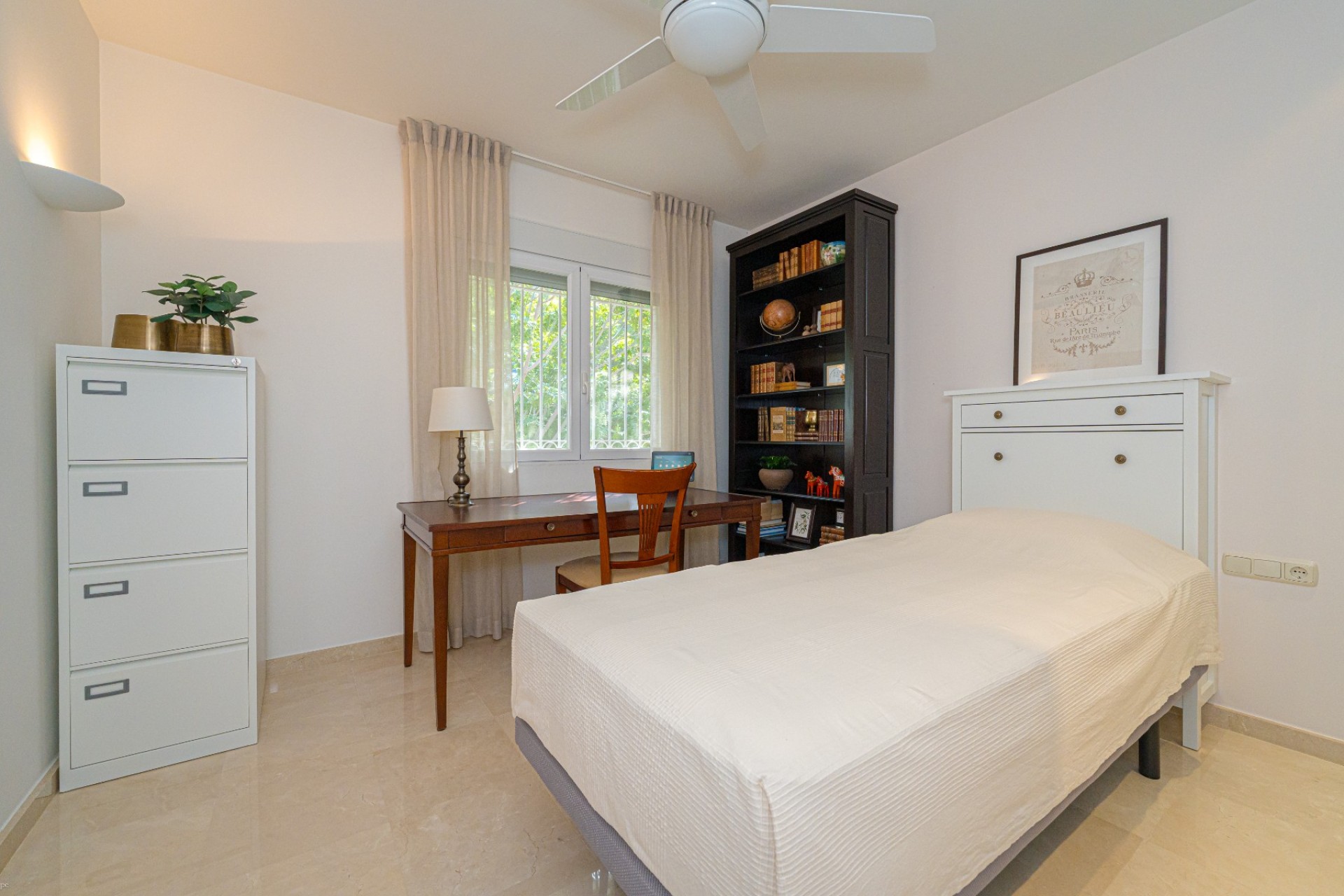 De indeling omvat vier slaapkamers, waarvan drie met een eigen badkamer. De master suite beschikt tevens over een apart privéterras, terwijl de vierde slaapkamer, momenteel in gebruik als kantoor, ook toegang heeft tot een privéterras. Op de begane grond heeft één van de slaapkamers een eigen badkamer, waardoor er een functionele leefruimte op één niveau ontstaat.