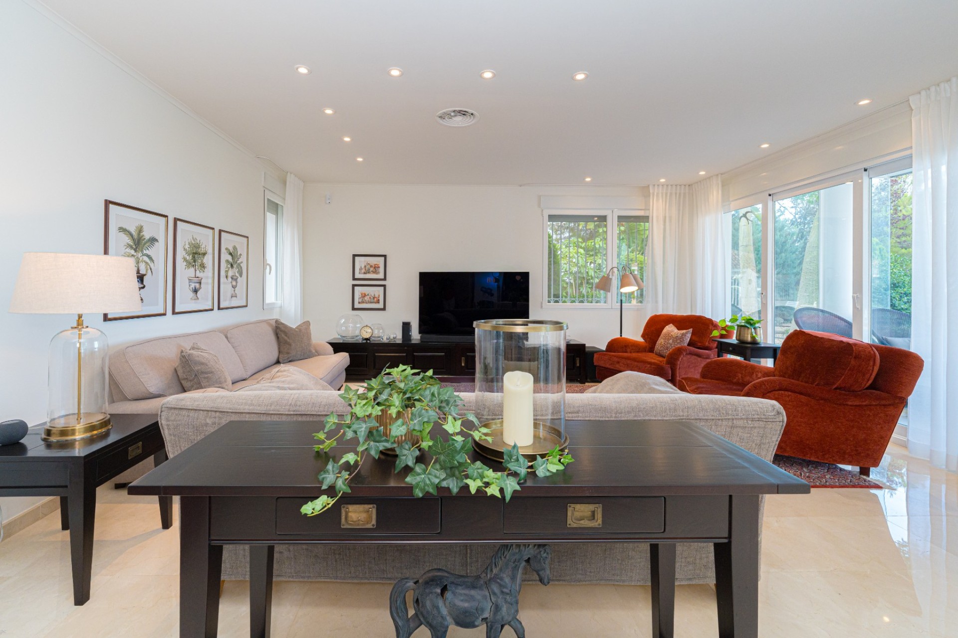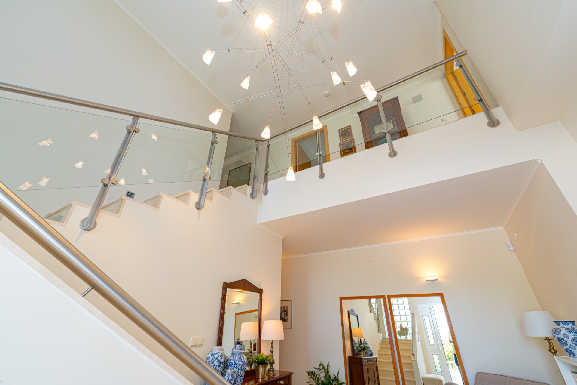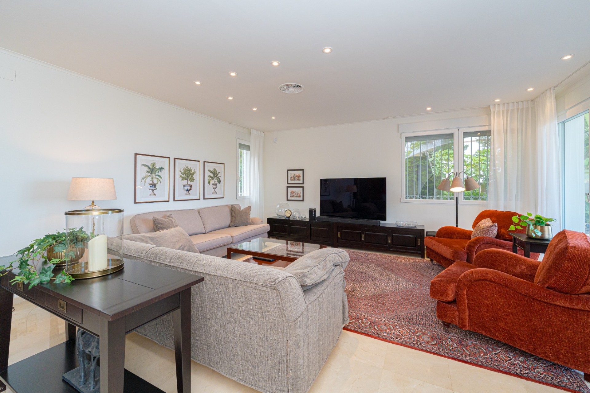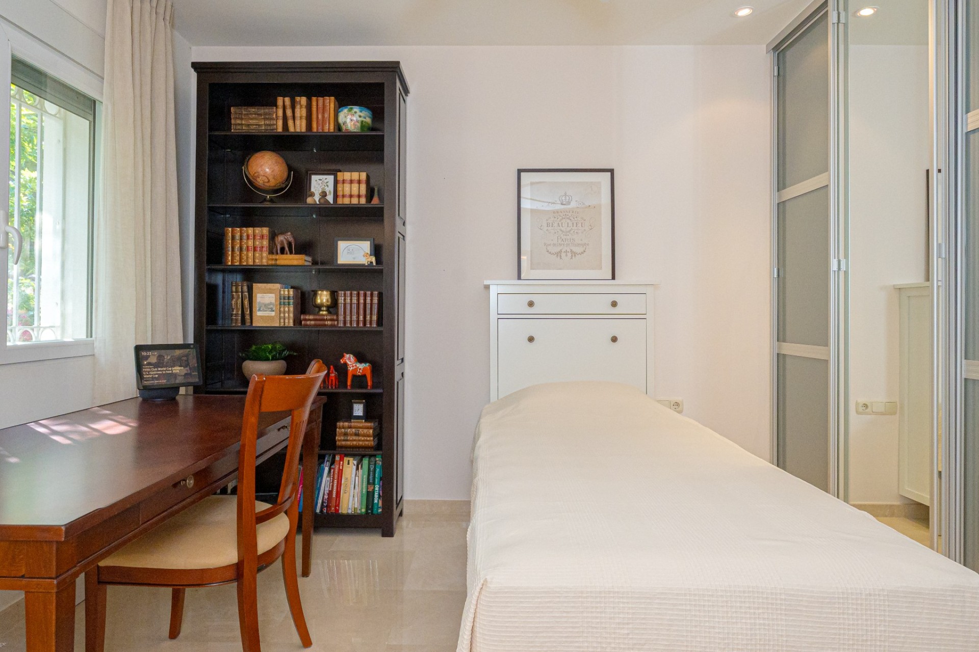 De indeling omvat vier slaapkamers, waarvan drie met een eigen badkamer. De master suite beschikt tevens over een apart privéterras, terwijl de vierde slaapkamer, momenteel in gebruik als kantoor, ook toegang heeft tot een privéterras. Op de begane grond heeft één van de slaapkamers een eigen badkamer, waardoor er een functionele leefruimte op één niveau ontstaat.