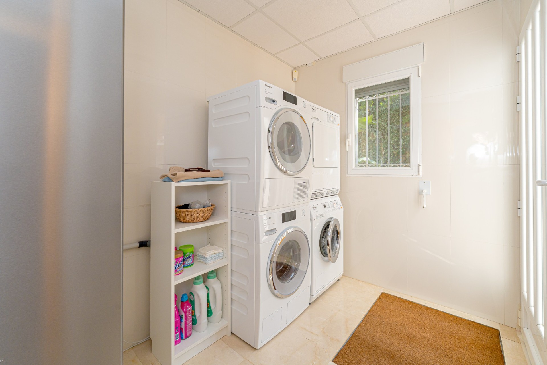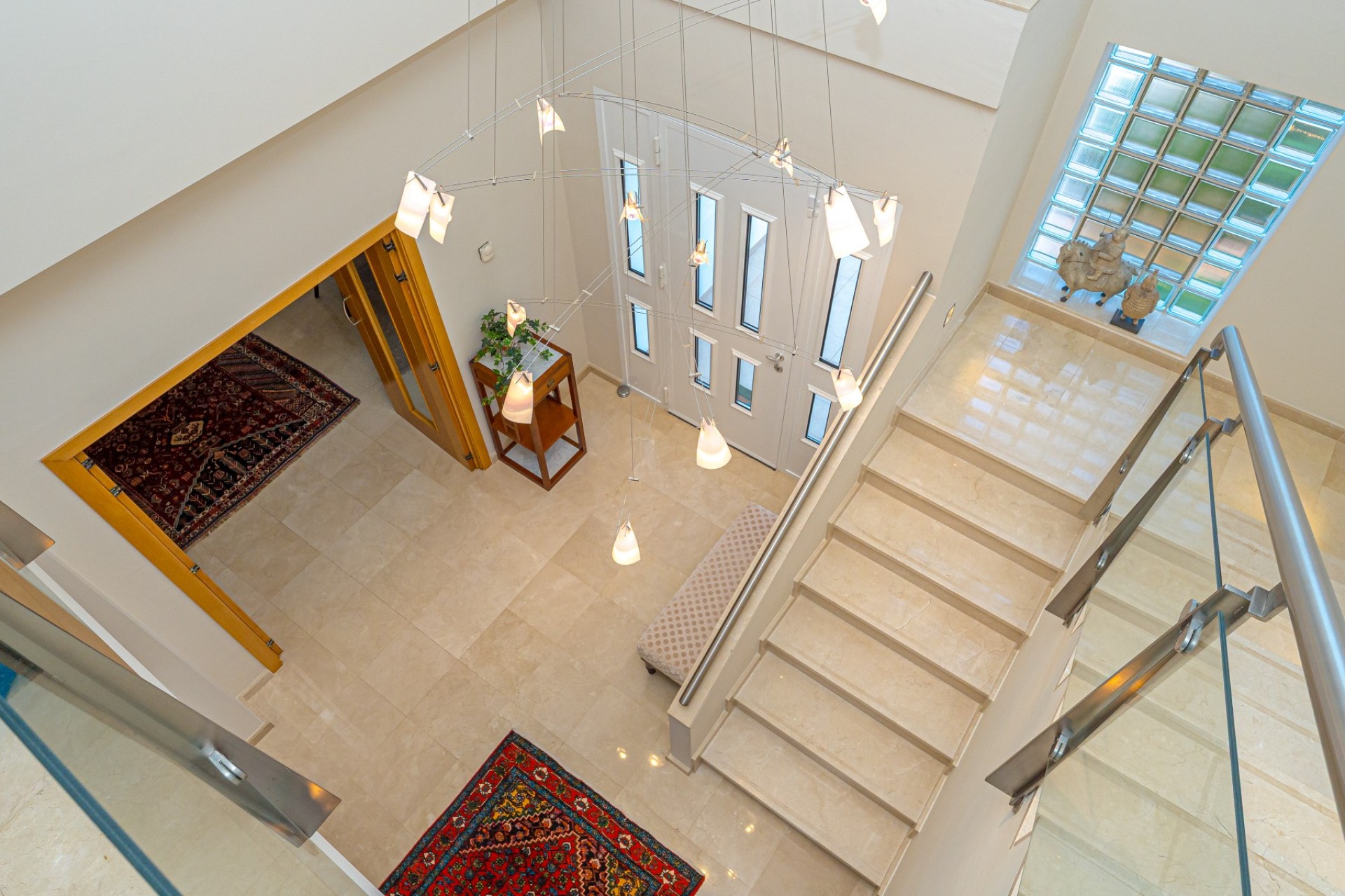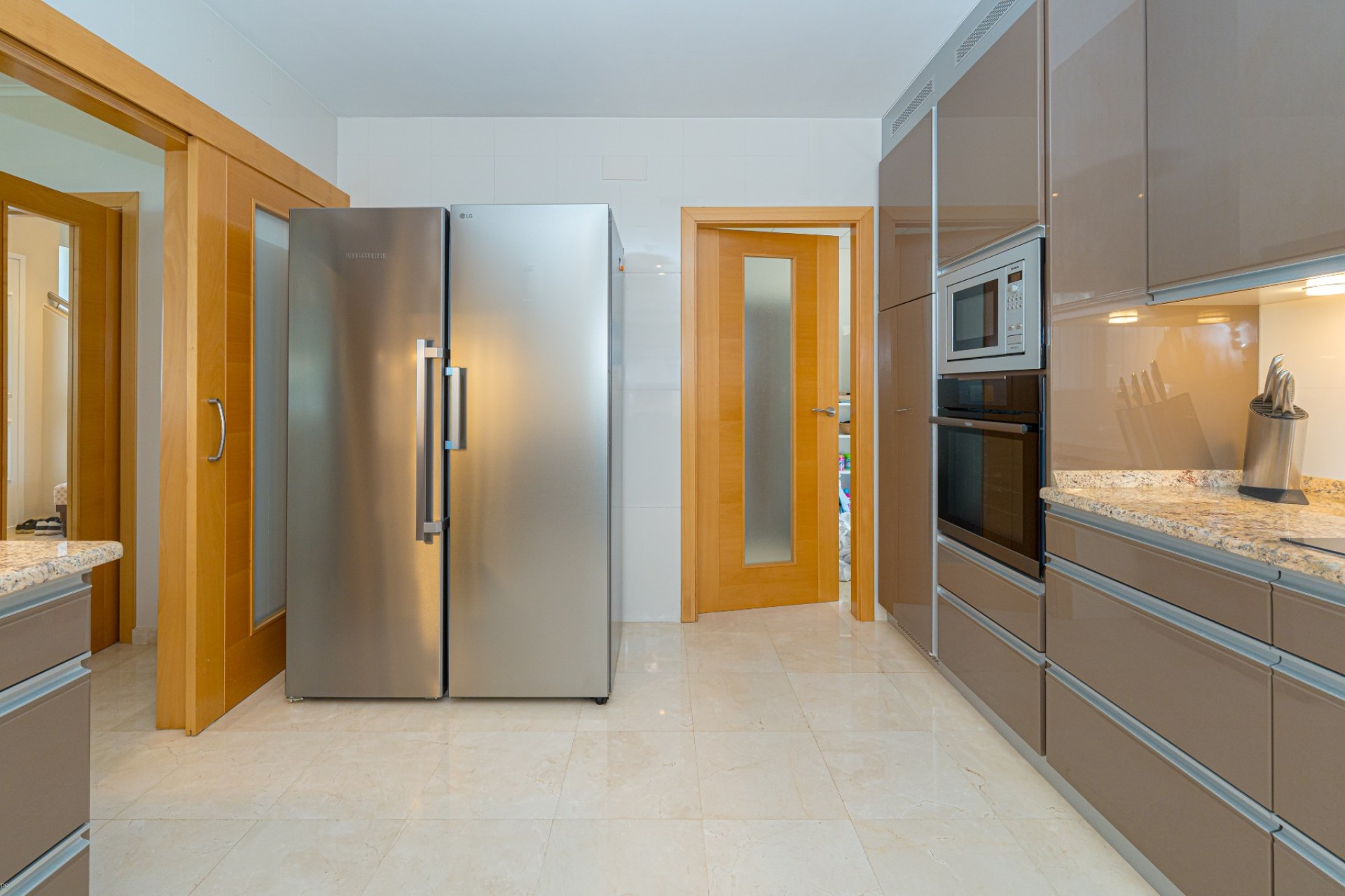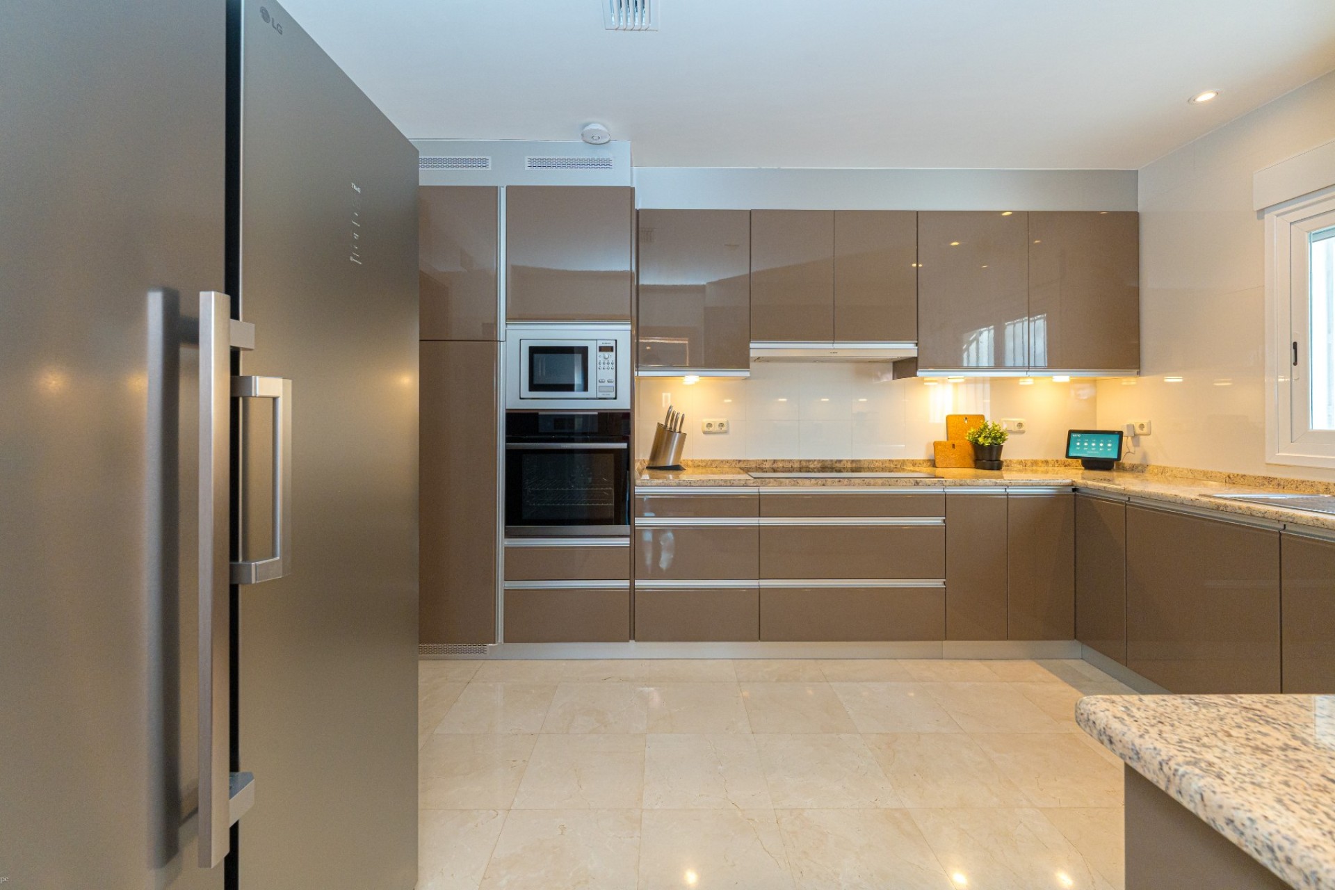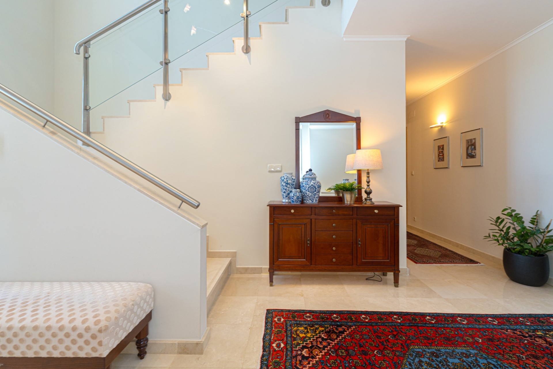 De indeling omvat vier slaapkamers, waarvan drie met een eigen badkamer. De master suite beschikt tevens over een apart privéterras, terwijl de vierde slaapkamer, momenteel in gebruik als kantoor, ook toegang heeft tot een privéterras. Op de begane grond heeft één van de slaapkamers een eigen badkamer, waardoor er een functionele leefruimte op één niveau ontstaat.